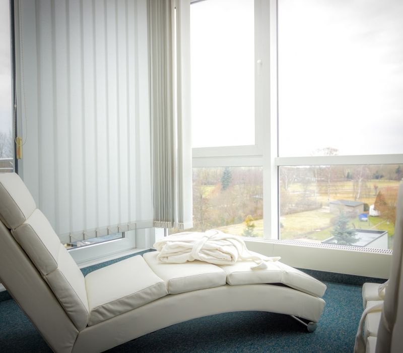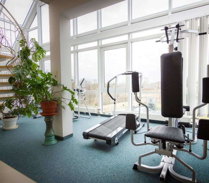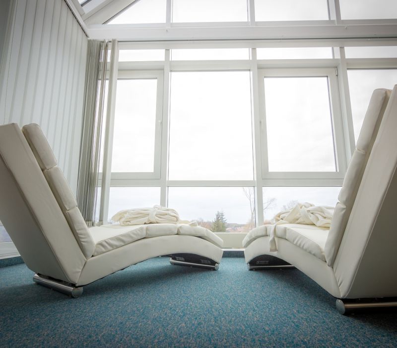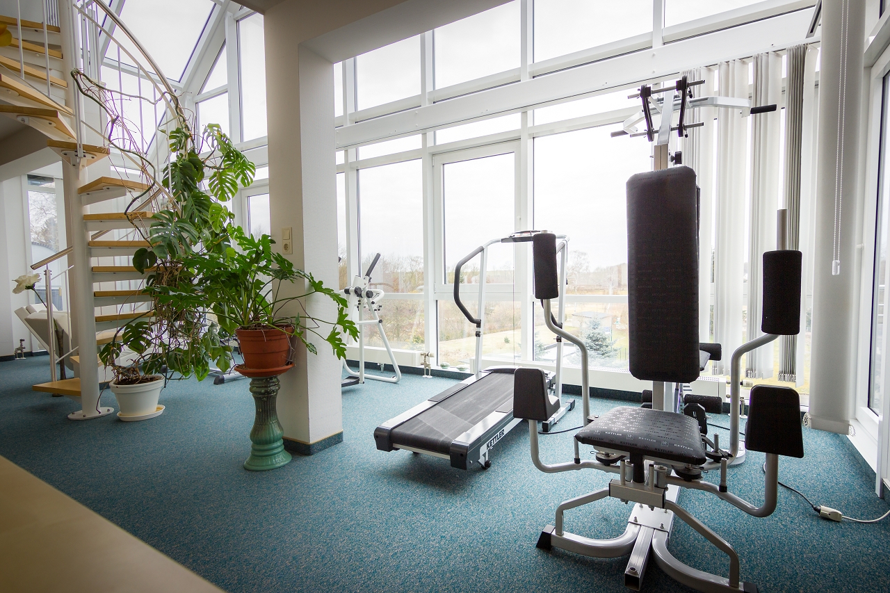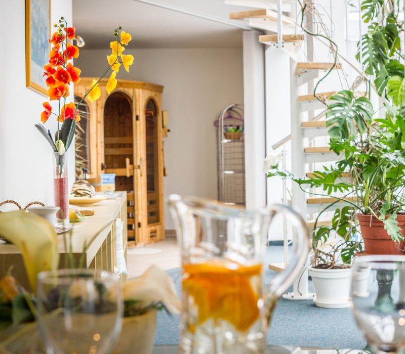 Hinter einer großzügigen Glasfront mit Atriumdach und Balkon, befindet sich auf ca. 60m² unser kleiner aber feiner Wellnessbereich. Sauna, Infrarotkabine, Solarium, Sportgeräte stehen zur Verfügung. Auch Massagen sind buchbar. Der lichtdurchflutete Raum lädt zum relaxen ein.